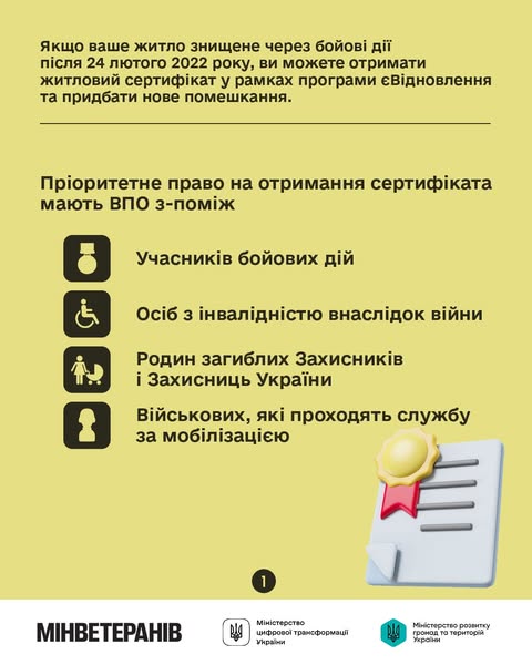 🔷Якщо ваше житло знищене через бойові дії після 24 лютого 2022 року, ви можете отримати житловий сертифікат у рамках програми єВідновлення та придбати нове помешкання.