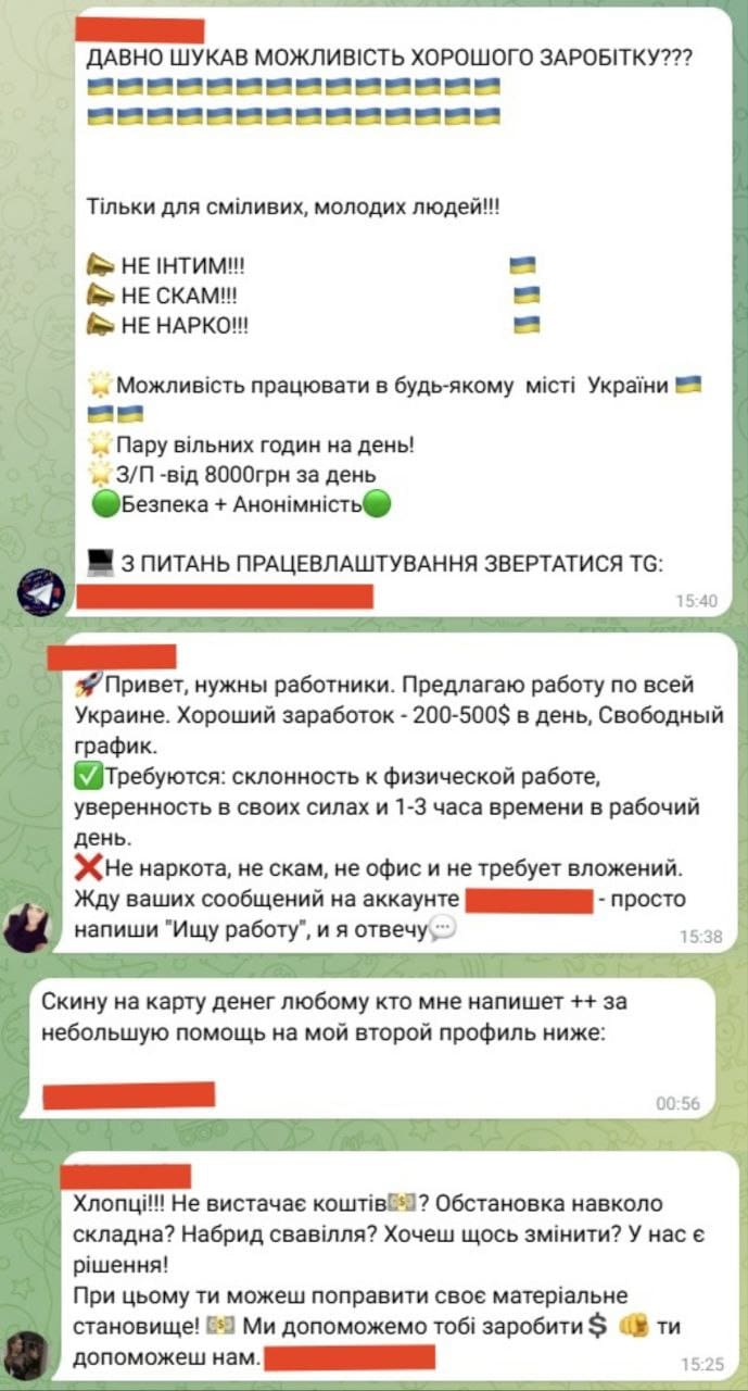 - Легкий і миттєвий заробіток по всій Україні без розкриття задач: Обіцяють швидкі гроші за “роботу з телефону”, уникаючи деталей, щоб не викликати підозр. Насправді це підготовка до підпалів чи передачі координат.