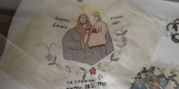 Можливо цей образ комусь видається надто простуватим, незграбним, а обриси Богородиці та Христа на ньому надто далекі від ідеалу. Все ж, за цими простими та навіть простакуватими силуетами прихована величезна глибина людської віри та незламності в найгірших, нелюдських умовах. У низу вишито: «На спомин з тюрми 20.05.49». Не знаю, як склалася доля цієї сильної жінки. Однак, не може не вражати те, що замість великого болю та випробовувань, пережитих у таборах, вона захотіла забрати з собою додому лише те, що було їй справді дороге – ікону Богородиці.