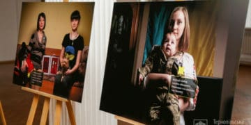 На виставці представлені роботи французького фотографа українського походження Юрія Білака.На світлинах – українські сім’ї розповідають історії своїх близьких-загиблих на війні з Росією.