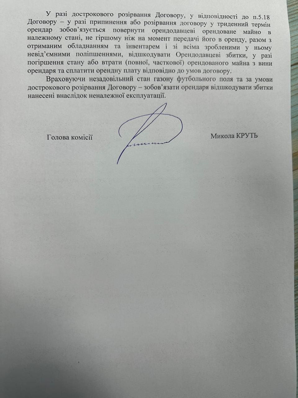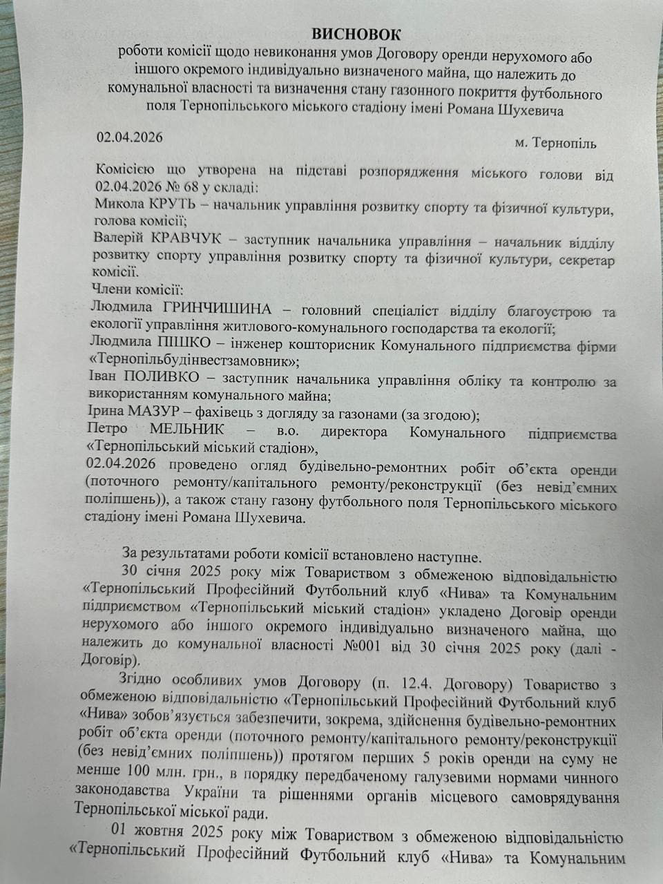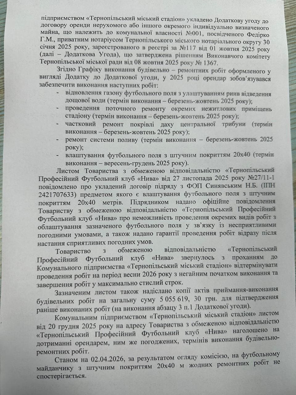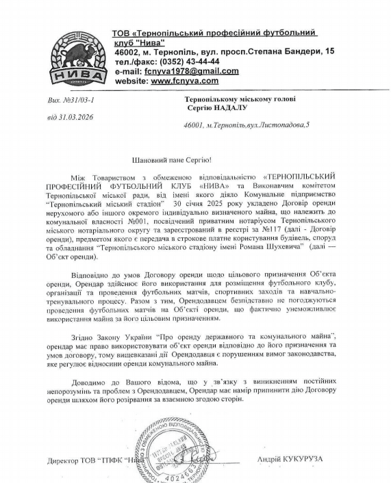 31 березня 2026 року клуб надсилає офіційний лист міському голові: «Орендар має намір припинити дію Договору оренди шляхом його розірвання за взаємною згодою сторін». Підпис, печатка, вихідний номер.Інвестори стверджують, що міська влада безпідставно не погоджуються проведення футбольних матчів. Але факти вперта річ – підстави є три – відсутність договорів щодо укриттів (і це в той час, коли Тернопіль під час обстрілу 19 листопада 2025 року втратив більше 40 невинних життів), незадовільний стан газону (висновок комісії з фахівцем), проведення попереднього матчу без дозволу. Лист «інвесторів» ігнорує всі три.