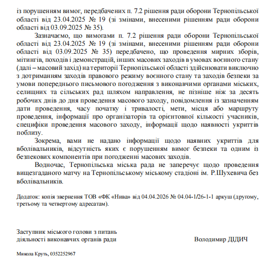 Міська влада дасть дозвіл на проведення матчу – бо для Тернополя футбол це цінність, а не інструмент тиску. Але дозвіл на матч – це не дозвіл на безвідповідальність.