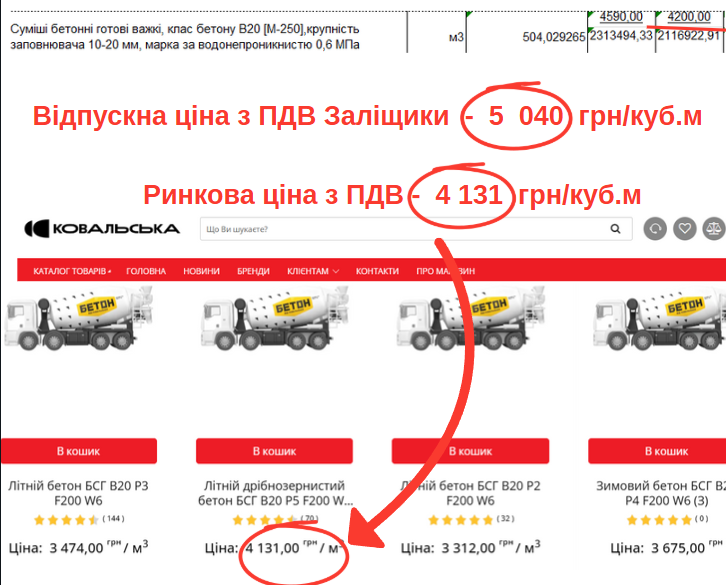 - Бетон В20 М-250 закладений по 5 040 грн/куб. м, тоді як ринкова вартість — від 3 150 до 4 131 грн/куб. м. Переплата — 505 тис. грн.