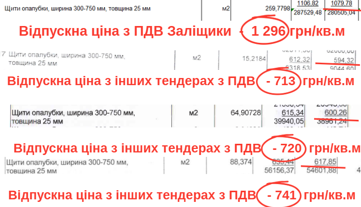 - Щити опалубки у кошторисі зазначені по 1 296 грн/кв. м, тоді як на тендерах у квітні в Тернопільській області їх купували по 713–741 грн/кв. м. Переплата — 144 тис. грн.