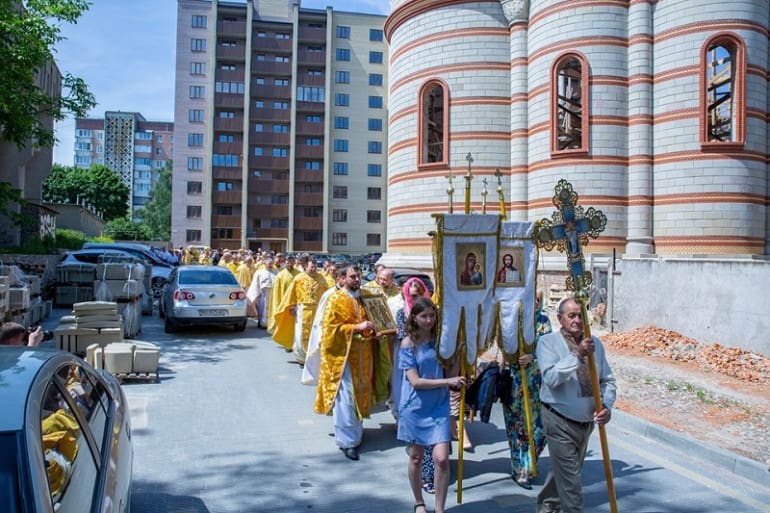 Після відпусту архієреї очолили хресний хід духовенства та мирян навколо місця будівництва собору святих рівноапостольних Костянтина та Єлени. Біля його стін священнослужителі та богомольці проспівали молебень до святих, а митрополит Антоній виголосив молитву, в якій просив благословення в Бога на храм, що зводиться.