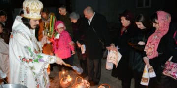 Після закінчення читання молитов, коли священнослужитель буде промовляти “Благословляється і освячується пожива ця”, візьміть зілля і тричі хрестовидно покропіть святою водою пасхальне приношення. Якщо нема зілля і нічого, що можна було б використати для окроплення, можна це зробити просто долонею.