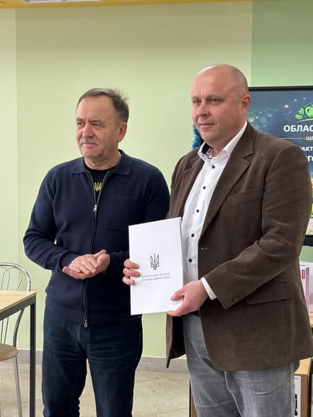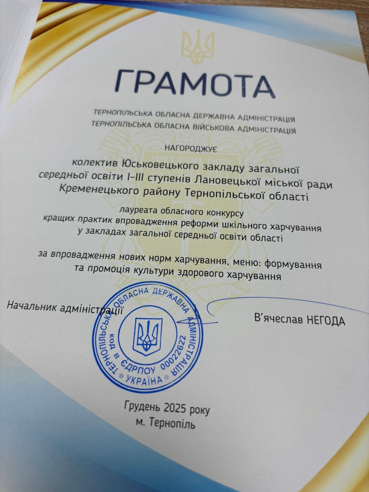 Нагороду директору Юськовецького ЗЗСО І-ІІІ ступенів Олексій Серафим вручив голова Тернопільської обласної військової адміністрації В’ячеслав Негода. Керівник закладу отримав грамоту та цінний подарунок.