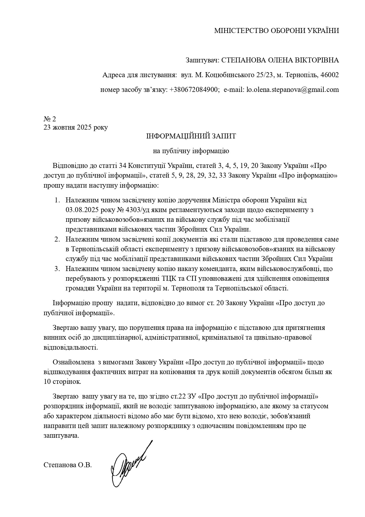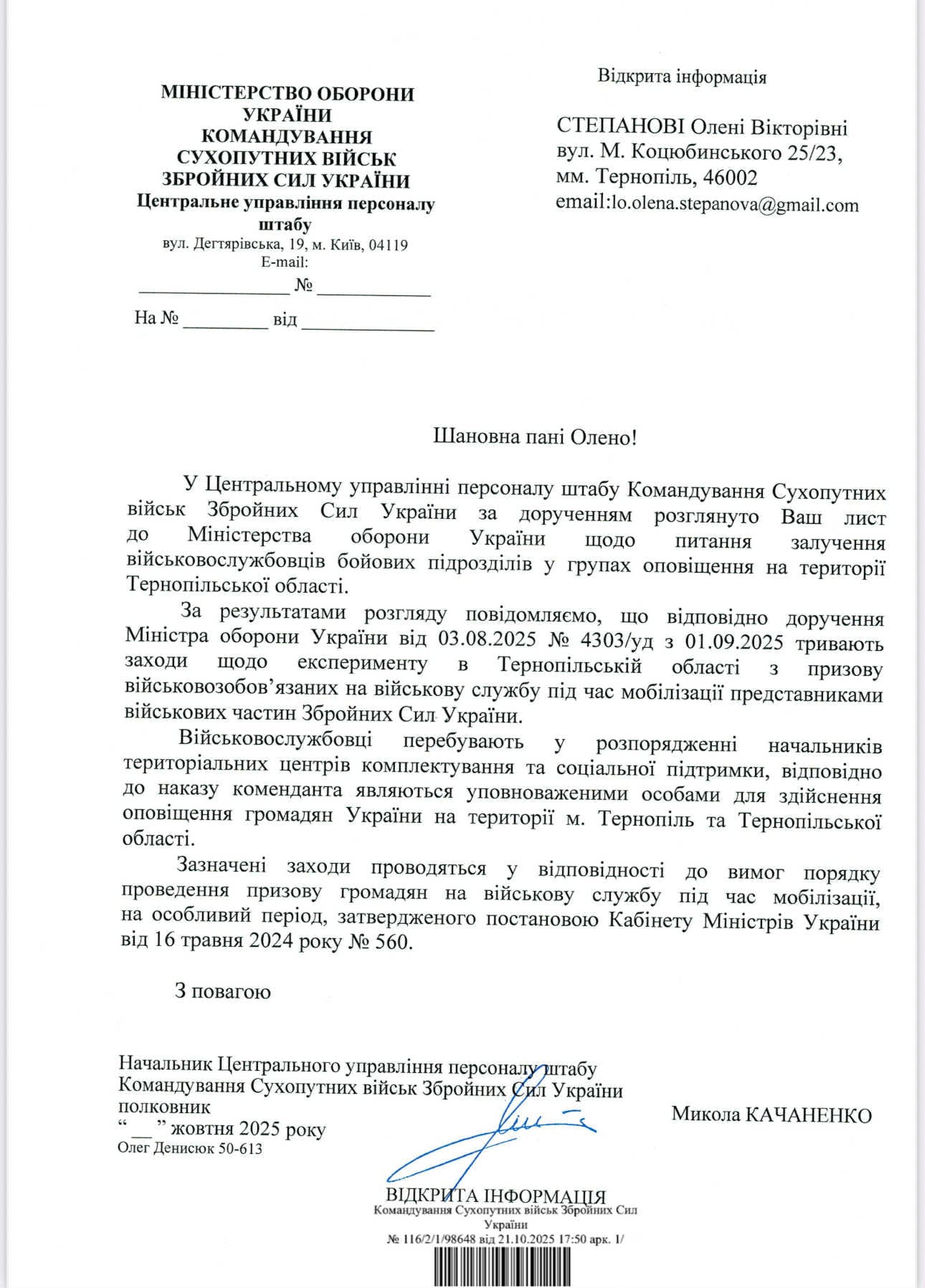 Адвокатка Олена Степанова заявила, що масові заходи з «рекрутингу» в Тернополі останніми місяцями були не ініціативою місцевих ТЦК, а експериментом Міністерства оборони.