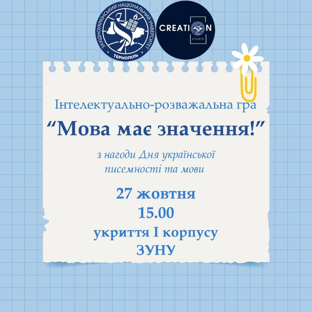 З нагоди Дня української писемності та мови, який відзначається 27 жовтня, Західноукраїнський національний університет (ЗУНУ) організовує інтелектуально-розважальну гру «Мова має значення». Захід проводить відділ творчої самореалізації та виховання ЗУНУ, запрошуючи студентську молодь долучитися до святкування.